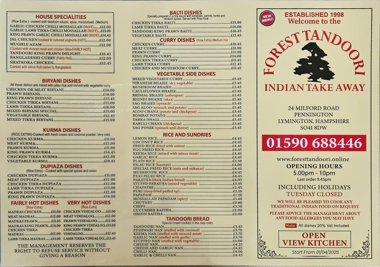 Here you will find information about the business, menu, latest offers and more. Forest Tandoori has been proudly serving the community of lymington since 1998. With your support we have been able to overcome the difficulties we faced in recent years. We look forward to the future where we can be of service.